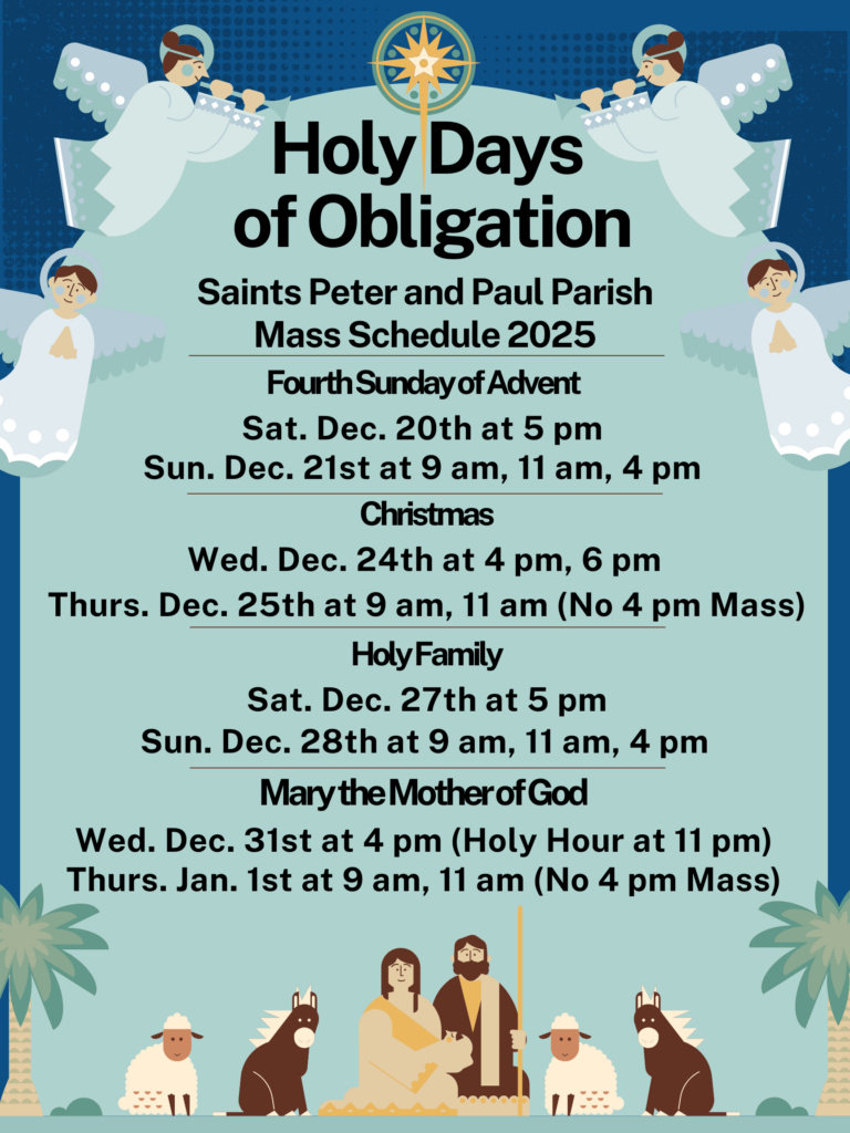 Welcome to Sts. Peter & Paul Parish website! We hope you will find a home here and invite you to see our Mass & Confession Schedule, as well as the Apostolates, which make Sts. Peter & Paul a parish for living out the call to holiness. In addition, you can always find a list of upcoming events below which we hope to see you at! If you would like to learn a little bit more of our parish and its history, take a look at our About Us page.