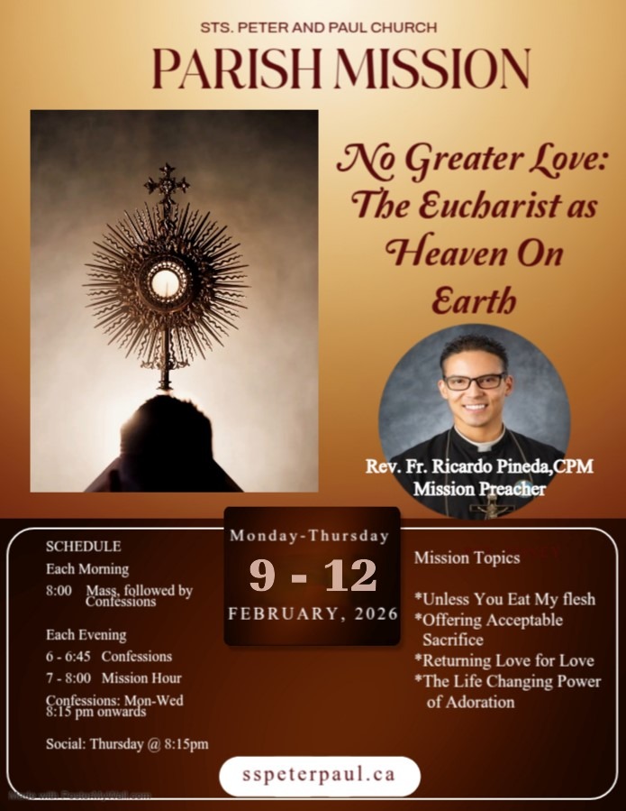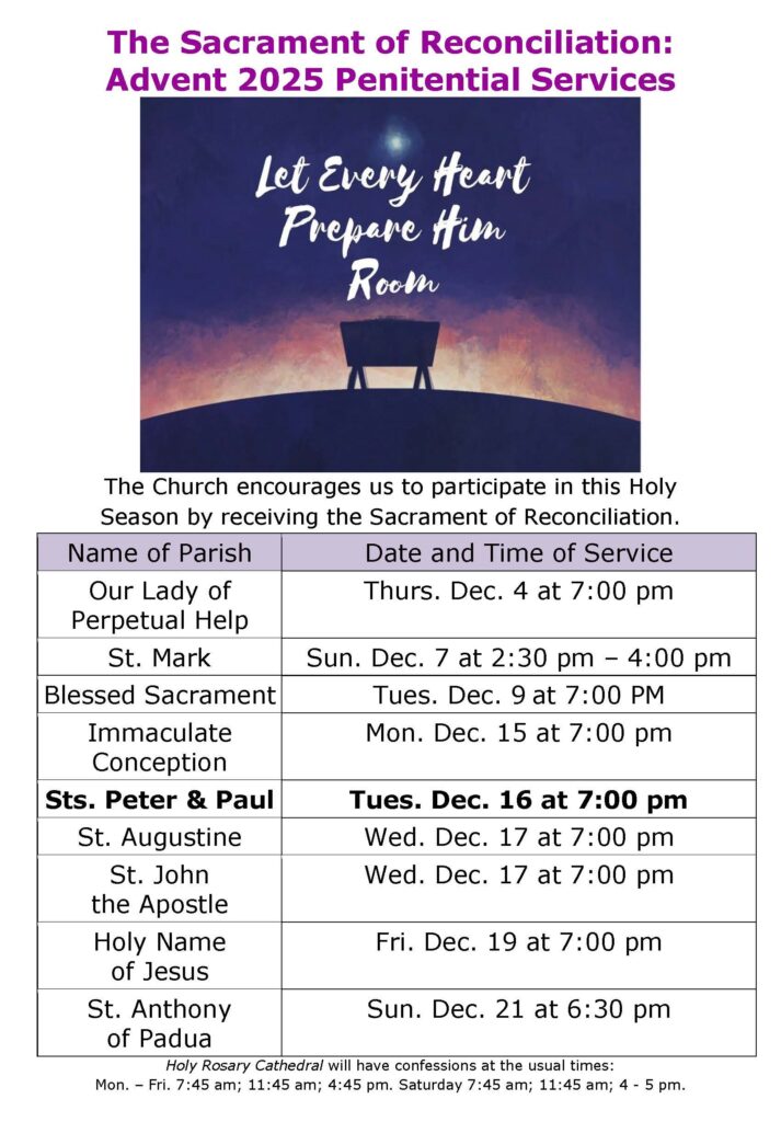 Welcome to Sts. Peter & Paul Parish website! We hope you will find a home here and invite you to see our Mass & Confession Schedule, as well as the Apostolates, which make Sts. Peter & Paul a parish for living out the call to holiness. In addition, you can always find a list of upcoming events below which we hope to see you at! If you would like to learn a little bit more of our parish and its history, take a look at our About Us page.